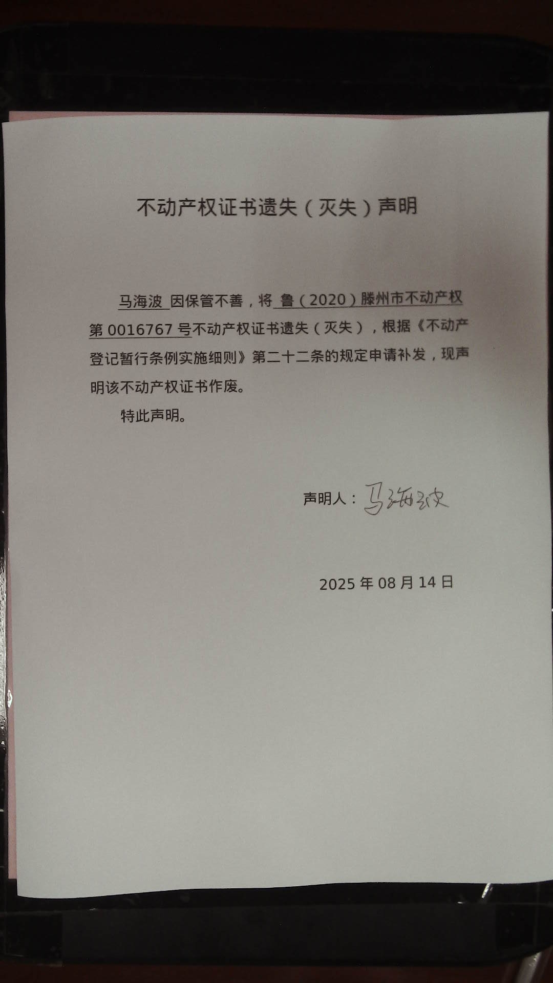 滕州市自然資源局不動產權證書遺失(滅失)聲明