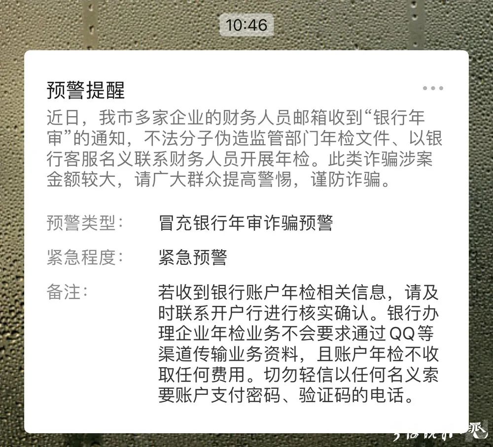 反詐提醒:若收到銀行賬戶年檢相關信息,請及時聯系開戶行進行核實確認。銀行辦理企業年檢業務不會要求通過QQ等渠道傳輸業務資料,且賬戶年檢不收取任何費用。建議企業提高防范意識,加強內部人員溝通,切勿輕信以任何名義索要賬戶支付密碼、驗證碼的電話,一旦發現疑似詐騙或被騙,請及時撥打110或96110,準確提供轉賬時間、金額、對方賬戶等信息,配合警方做好止損、取證等工作。