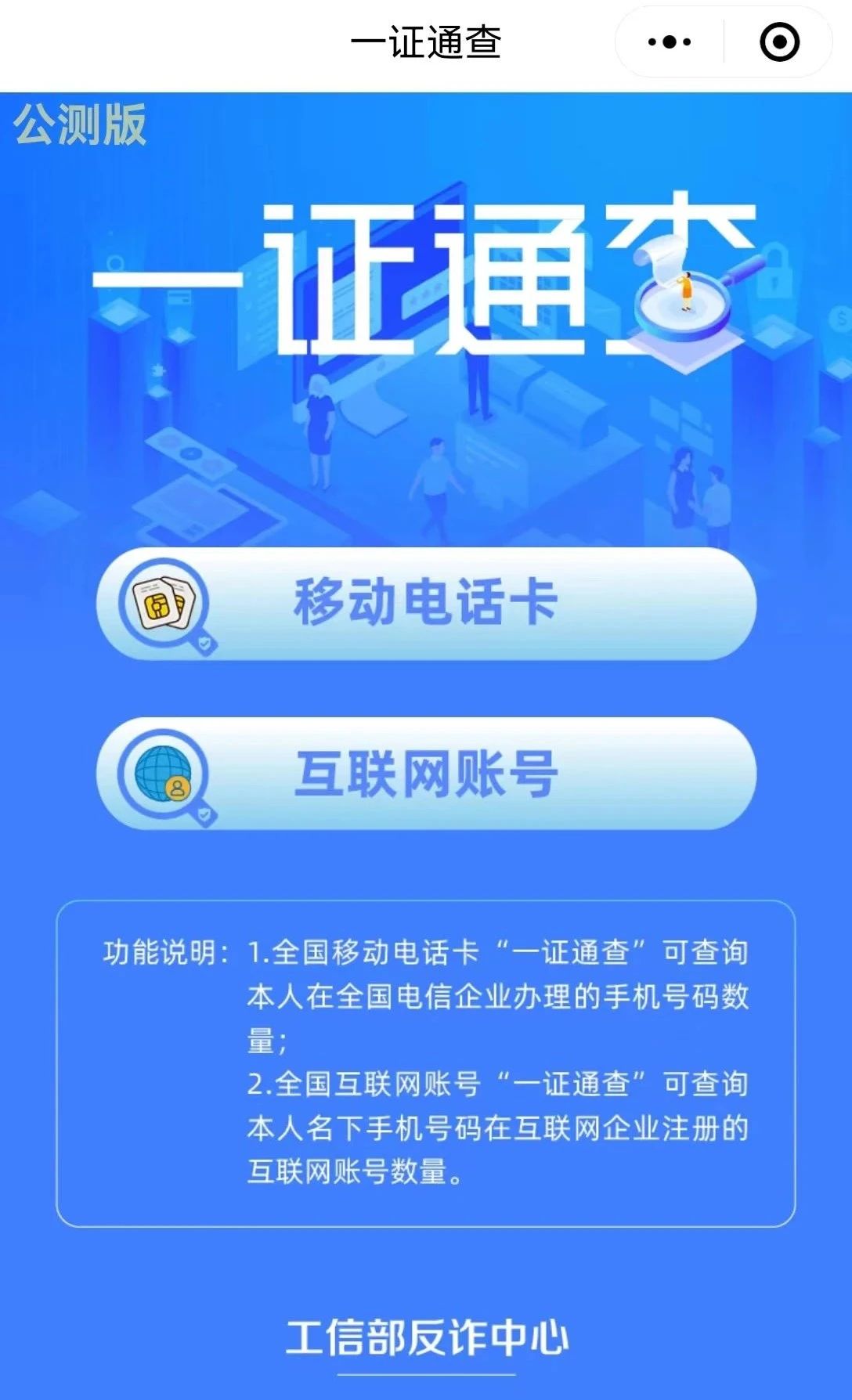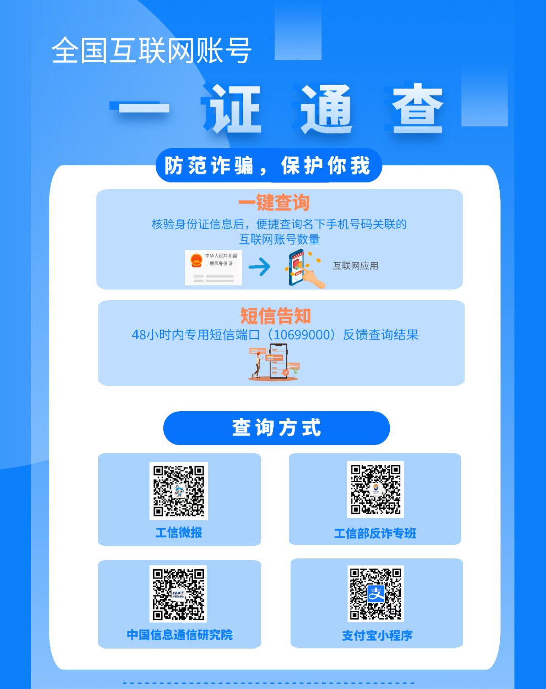用戶(hù)可以通過(guò)工業(yè)和信息化部政務(wù)微信號(hào)“工信微報(bào)”和“工信部反詐專(zhuān)班” “中國(guó)信通院”微信公眾號(hào),以及支付寶“一證通查”小程序等方式等進(jìn)入查詢(xún)?nèi)肟凇?/span>