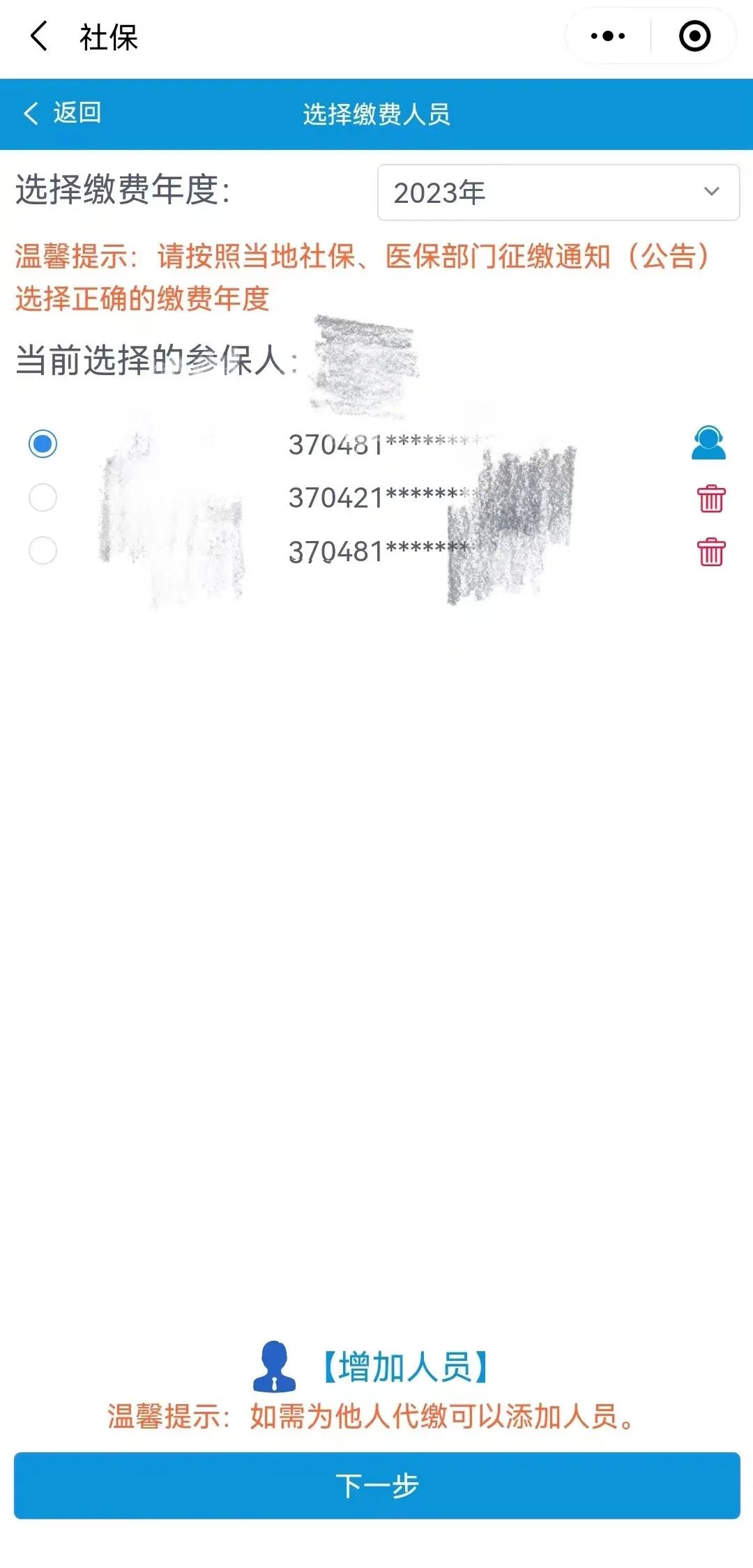 第三步,增加繳費人員,輸入姓名、身份證號(支持幫家人代繳),錄入信息后點擊下一步。