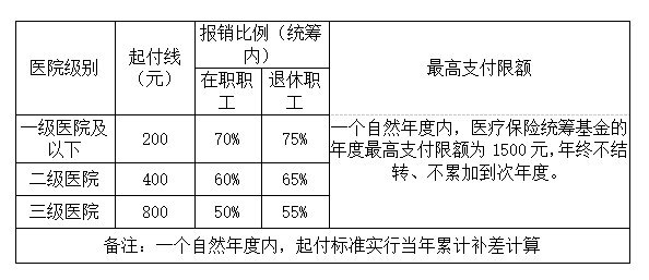 根據實際設定統一的門診統籌基金年度起付標準、支付比例和最高支付限額,不同級別的定點醫療機構設置差異化的起付標準和支付比例,適當向基層醫療機構傾斜,促進分級診療。對符合基本醫療保險基金支付范圍的費用,由基本醫療保險按照下表報銷政策進行支付。