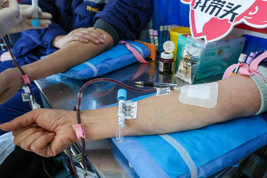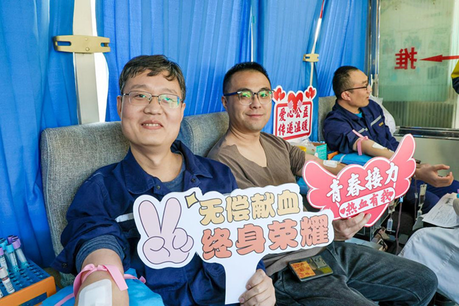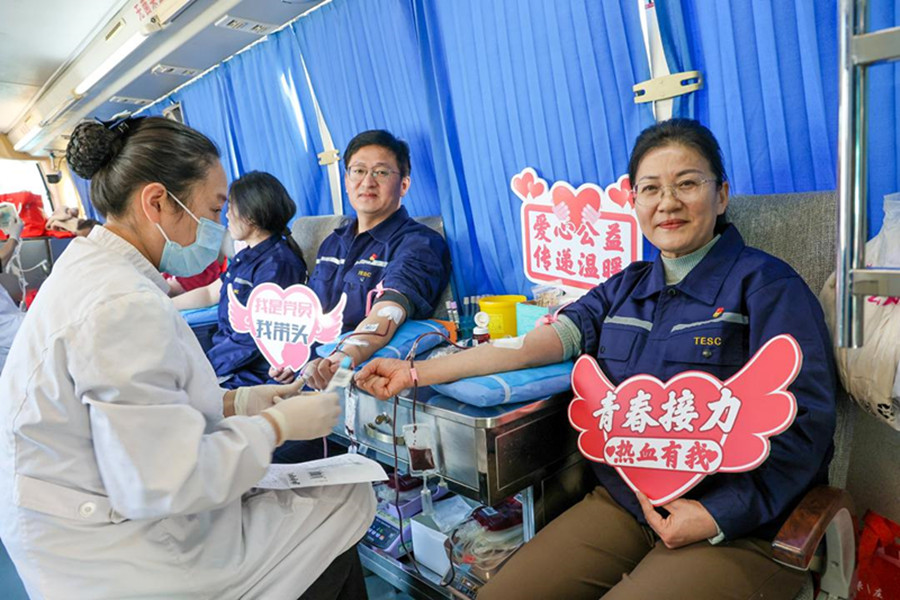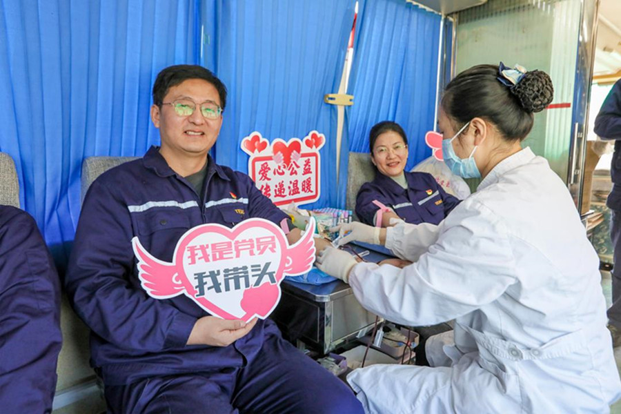 2025年11月26日,在山東滕州東方鋼簾線有限公司,黨員在采血車上踴躍獻血。