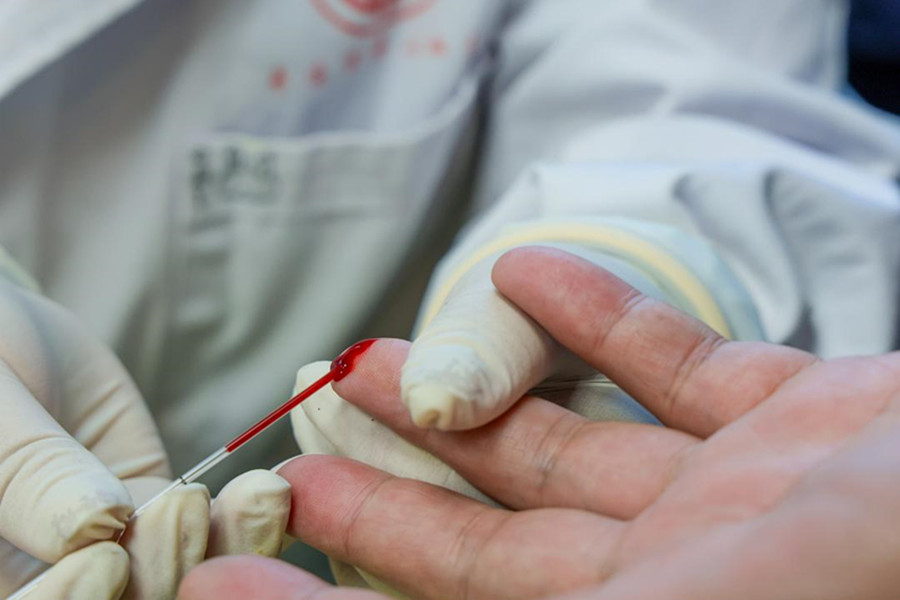 11月26日,在山東滕州東方鋼簾線有限公司的獻血車內,醫務人員為獻血者進行血樣檢測。